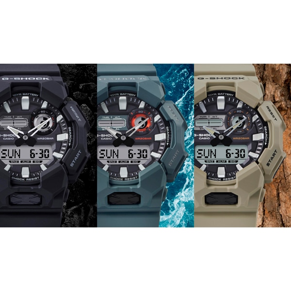 ワイドフェイスとビッグケースで、10年バッテリーを搭載したデジタルモデルのGD-010とデジタルアナログコンビモデルのGA-010は、ワールドタイム、ストップウオッチといった基本機能をはじめ、大型フロントボタンで操作しやすいスーパーイルミネーターにより暗闇での視認性も確保します。