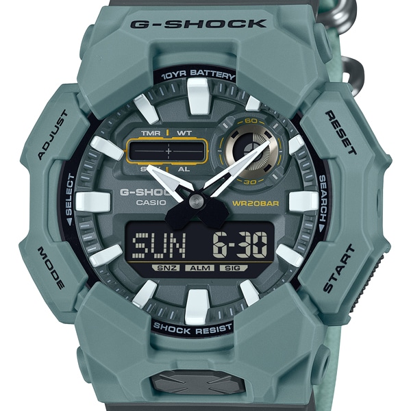 ハードな使用に耐える耐衝撃性能と、長く使える電池寿命約10年を同時に実現したGA-010、GD-010。主な樹脂パーツにバイオマスプラスチックを使用し、環境負荷低減に貢献することが期待されています。