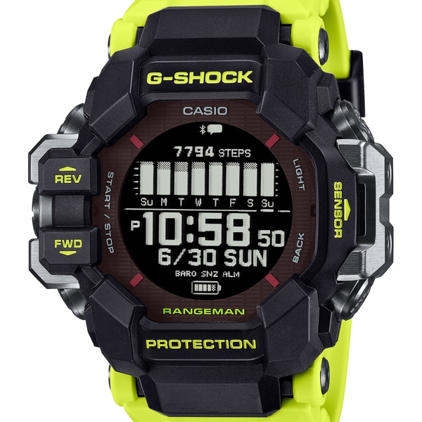 RANGEMAN GPR-H1000RYは、耐衝撃構造に加え、防塵・防泥構造に、心拍計をはじめとした6つのセンサーと、位置・距離・移動速度の計測に対応したGPS機能を搭載。トレッキングなど、9種類のアクティビティをリアルタイム計測します。厳しい環境下でも、すばやい判断および的確な行動をサポートするタフネスウオッチです。