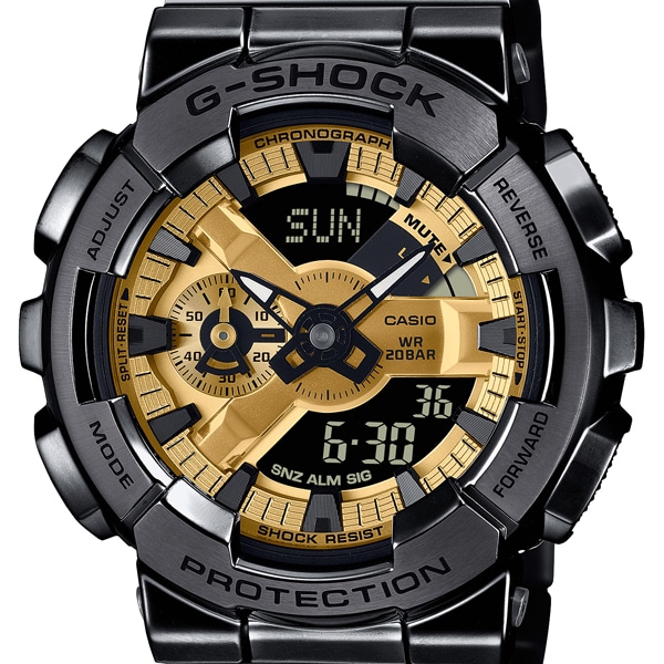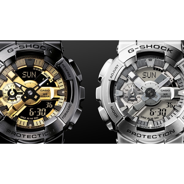 1983年の発売以来、究極の強さを求めて進化を続けるタフネスウオッチG-SHOCK。そのアイコニックなスタイルで人気モデルのひとつであるビッグケースのアナログ・デジタルコンビネーション、「110シリーズ」のベゼルとバンドを金属素材にアップデートしたGM-110です。