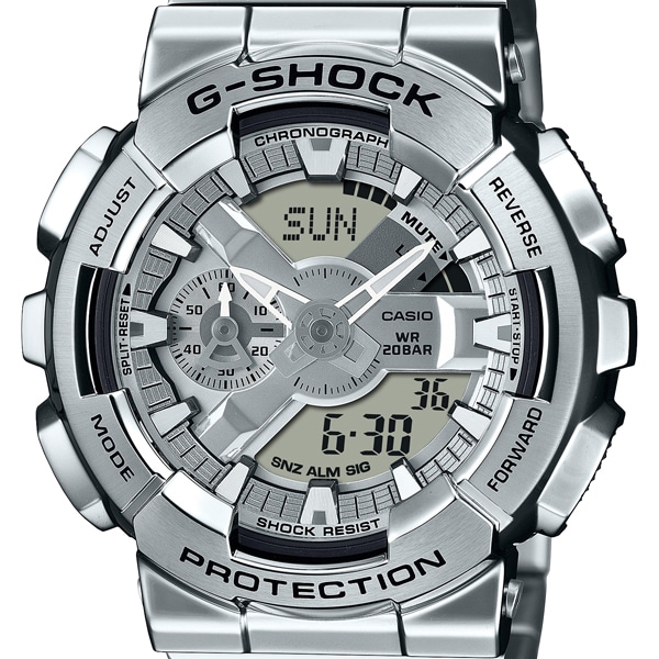 1983年の発売以来、究極の強さを求めて進化を続けるタフネスウオッチG-SHOCK。そのアイコニックなスタイルで人気モデルのひとつであるビッグケースのアナログ・デジタルコンビネーション、「110シリーズ」のベゼルとバンドを金属素材にアップデートしたGM-110です。