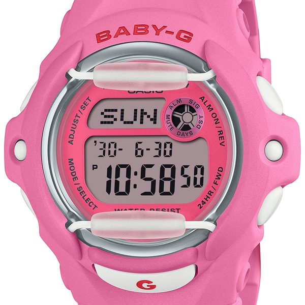 アクティブな女性に向けた耐衝撃・カジュアルウオッチBABY-Gから、ポップで元気なベースカラーにチェリーカラーのアクセントを効かせたモデルです。