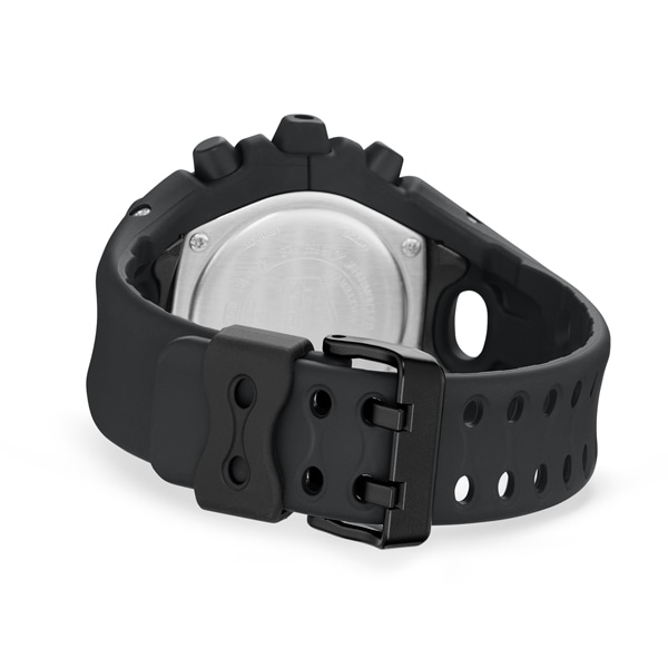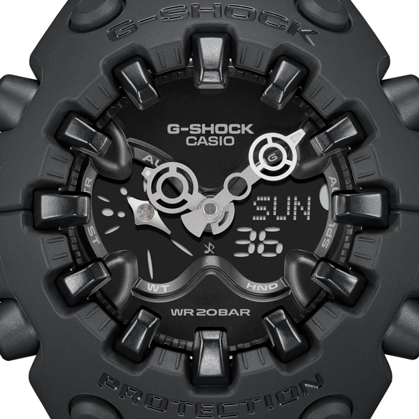 エッジの効いたパーツを組み合わせた有機的な外装フォルム、2つの穴が大きな特徴となっている新開発のショックリリース針など、今までの常識を覆す斬新な発想で、強さを求めて挑戦を続けるG-SHOCKのアイデンティティを形にしました。モジュールを保護するセンターケースを、ベゼル・バンド一体構造の外装パーツでカバー。大型の立体インデックスをガラス上面に配置することで、衝撃を緩和するバンパーの役割を持たせました。G-SHOCK独自の耐衝撃性能をキープしながら、ユニークかつ力強い外装デザインを実現しています。衝撃の影響を受けやすい針をシャフトに固定せず、磁石の力で取り付けるマグネティックホールディング構造を開発しました。この構造で取り付けたショックリリース針(分針)は、磁力で固定されているため、受けた衝撃を受け流すことができます。本構造を採用することで、針の大型化やデザインの自由度を上げることが可能になりました。