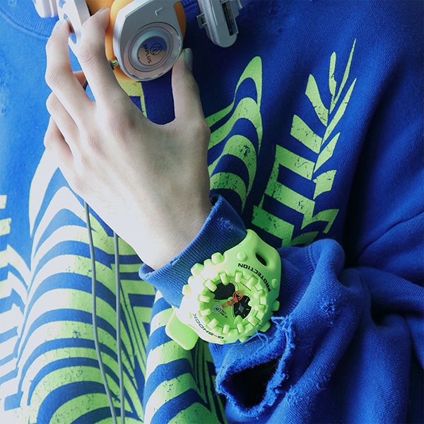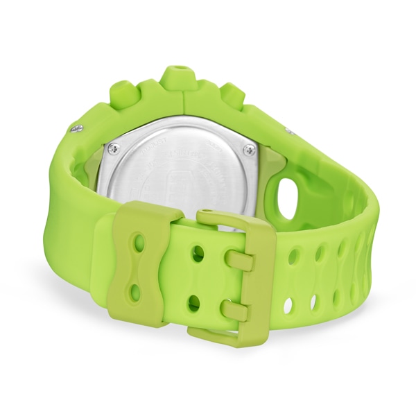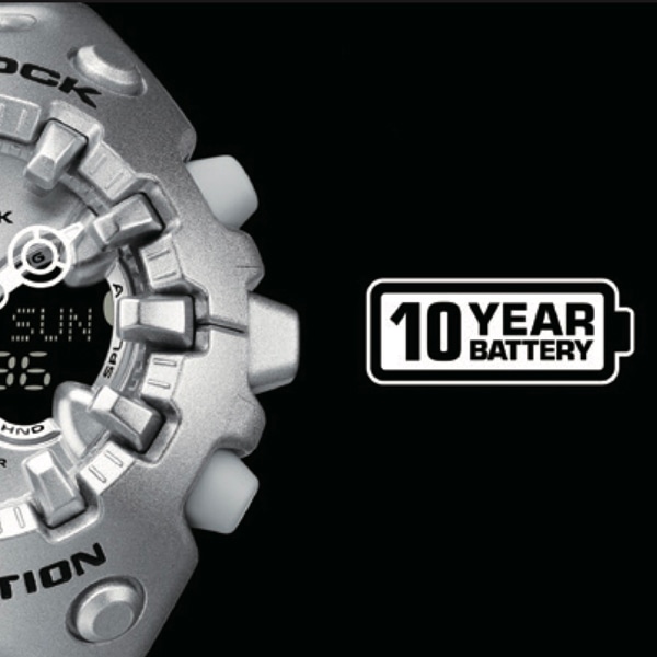 アナログ・デジタルコンビネーションタイプのフェイスに、オープンワーク(透かしの部分をつくる技法)を施したダイアルとフルスクリーンLCDのレイヤー構造を採用。センターに異形タイプの時分針、液晶内に小針をレイアウトするなど、個性的なデザインに仕上げています。カラーは4色。シルバーのメタリックカラー、ブルーパープルやネオンイエロー、そしてG-SHOCKらしいブラックをラインアップしました。大容量電池の採用と低消費電力化により、アラームやライトなどの機能を搭載しながら電池寿命約10年を実現したモデルです。