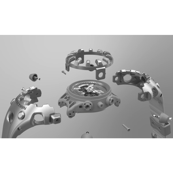 エッジの効いたパーツを組み合わせた有機的な外装フォルム、2つの穴が大きな特徴となっている新開発のショックリリース針など、今までの常識を覆す斬新な発想で、強さを求めて挑戦を続けるG-SHOCKのアイデンティティを形にしました。モジュールを保護するセンターケースを、ベゼル・バンド一体構造の外装パーツでカバー。大型の立体インデックスをガラス上面に配置することで、衝撃を緩和するバンパーの役割を持たせました。G-SHOCK独自の耐衝撃性能をキープしながら、ユニークかつ力強い外装デザインを実現しています。衝撃の影響を受けやすい針をシャフトに固定せず、磁石の力で取り付けるマグネティックホールディング構造を開発しました。この構造で取り付けたショックリリース針(分針)は、磁力で固定されているため、受けた衝撃を受け流すことができます。本構造を採用することで、針の大型化やデザインの自由度を上げることが可能になりました。