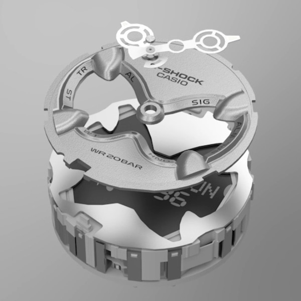 エッジの効いたパーツを組み合わせた有機的な外装フォルム、2つの穴が大きな特徴となっている新開発のショックリリース針など、今までの常識を覆す斬新な発想で、強さを求めて挑戦を続けるG-SHOCKのアイデンティティを形にしました。モジュールを保護するセンターケースを、ベゼル・バンド一体構造の外装パーツでカバー。大型の立体インデックスをガラス上面に配置することで、衝撃を緩和するバンパーの役割を持たせました。G-SHOCK独自の耐衝撃性能をキープしながら、ユニークかつ力強い外装デザインを実現しています。衝撃の影響を受けやすい針をシャフトに固定せず、磁石の力で取り付けるマグネティックホールディング構造を開発しました。この構造で取り付けたショックリリース針(分針)は、磁力で固定されているため、受けた衝撃を受け流すことができます。本構造を採用することで、針の大型化やデザインの自由度を上げることが可能になりました。