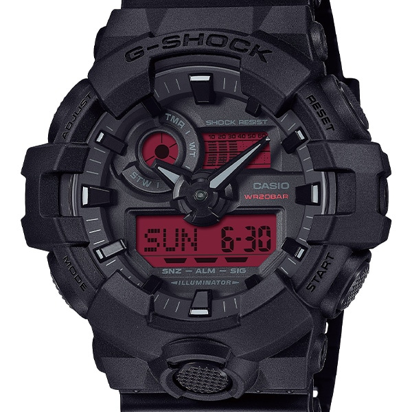タフネスを追求し進化を続けるG-SHOCKから、ブランドカラーのブラックとレッドにこだわったシリーズのご紹介です。ベゼル、バンド、文字板にブラックを採用し、フェイス部にある液晶には、新たに高彩度のカラー液晶(視認性を改善した液晶)を用いて、デザイン性を高めたシリーズです。ライト点灯時にはデジタル表示の文字部分が点灯し、視認性を確保します。ブラックを基調にクールに仕上げたモデルです。