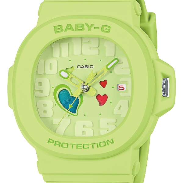大小4つのハート型の窓から、文字板下層に配したカラーディスクの色が見え隠れ。カラフルな日付表示とともに日替わりで色が変わる、遊び心のあるフェイスに仕上げました。また、丸みを帯びた立体形状のアラビアインデックスをレイアウトし、時刻が見やすい仕様になっています。さらに、ハートを射貫くキューピッドアローをイメージした秒針を採用。 アナログウオッチをBABY-Gらしくアレンジした、キュートなフェイスデザインです。