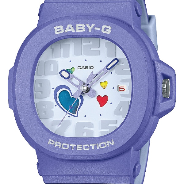 大小4つのハート型の窓から、文字板下層に配したカラーディスクの色が見え隠れ。カラフルな日付表示とともに日替わりで色が変わる、遊び心のあるフェイスに仕上げました。また、丸みを帯びた立体形状のアラビアインデックスをレイアウトし、時刻が見やすい仕様になっています。さらに、ハートを射貫くキューピッドアローをイメージした秒針を採用。 アナログウオッチをBABY-Gらしくアレンジした、キュートなフェイスデザインです。