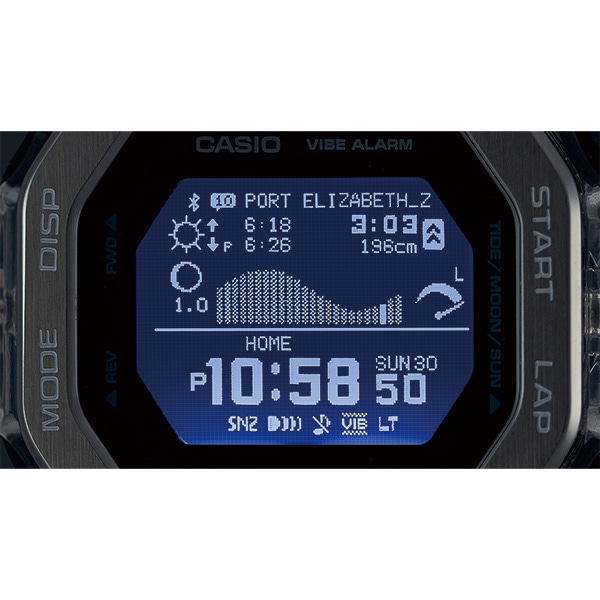バンドの主な樹脂パーツに、環境負荷低減への貢献が期待されるバイオマスプラスチックを使用しています。スマートフォンリンクを搭載し、専用のアプリケーションを介して、潮汐情報や日の出/日の入時刻を世界約3300カ所から選択できます。また、ワイドフェイスで高精細な液晶を採用。タイドグラフ、ムーンデータ表示に加え、満潮/干潮時刻、満潮/干潮の潮位、日の出/日の入時刻が表示可能です。トレーニング計測機能と合わせて、世界を飛び回りタフに戦い抜くサーファーを腕元からサポートします。ベゼルは樹脂とメタルを組み合わせて構成し、耐衝撃性能を備えました。バンドには、フィット性と水、汗逃げを考慮したスリットが入ったバイオマスプラスチックのソフトウレタンを採用し、着け心地を追求しました。