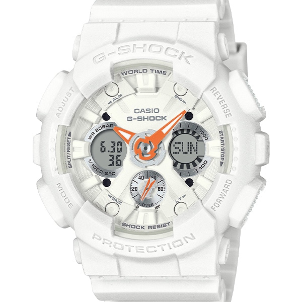 立体パーツで凹凸感を強調したユニークな文字板を、爽やかなホワイトのワントーン仕上げに。針にもホワイト蓄光を施しました。オレンジやブルーのアクセントカラーが、夏らしい開放感を演出します。