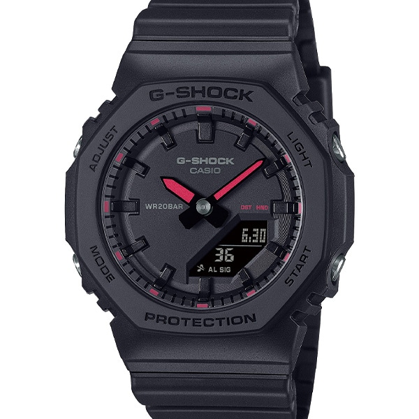 カラー針とミニッツマーカーの差し色に、ライトイエローやビビッドピンクを採用。針の蓄光カラーにも同系色をあしらいました。オールブラックを纏った八角形フォルムのシンプルデザインを、ビビッドな個性で彩ります。