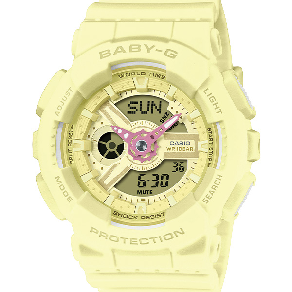 アクティブな女性に向けた耐衝撃・カジュアルウオッチBABY-Gから、柔らかなソフトカラーを纏ったデザインで、日常に彩りを添えるモデルです。