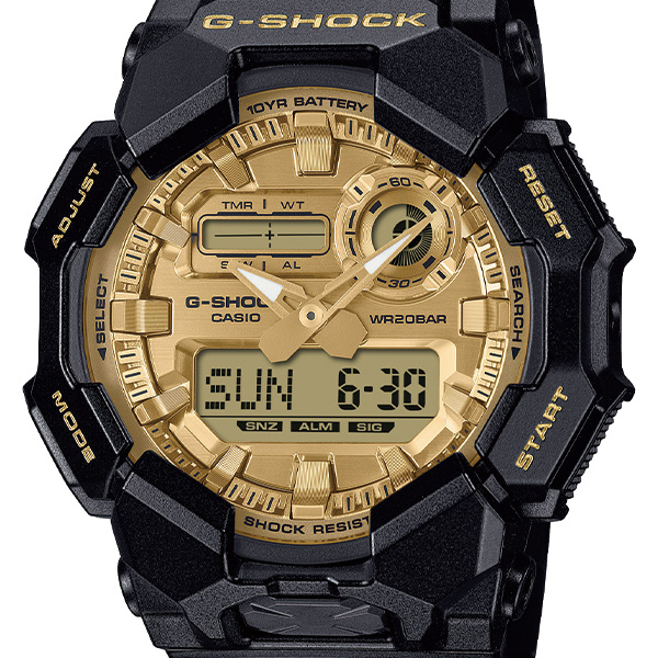 GD-010GB-1A9JFは文字板に、GA-010GB-1A9JFはインデックスにそれぞれゴールド蒸着を施し、ビッグフェイスデザインを一層際立たせています。