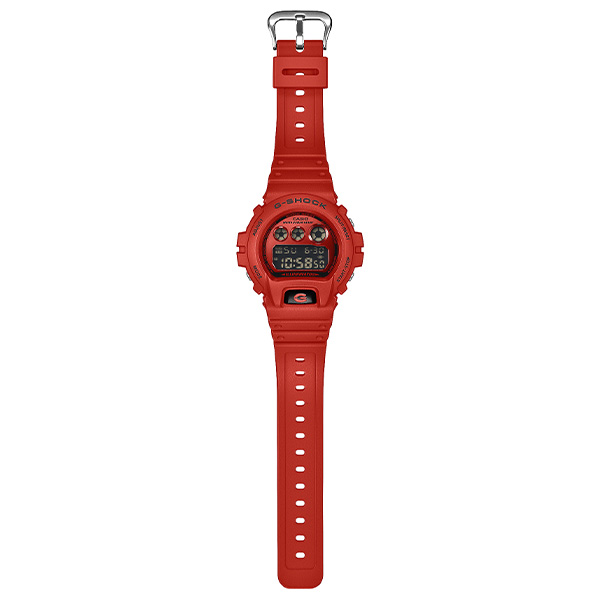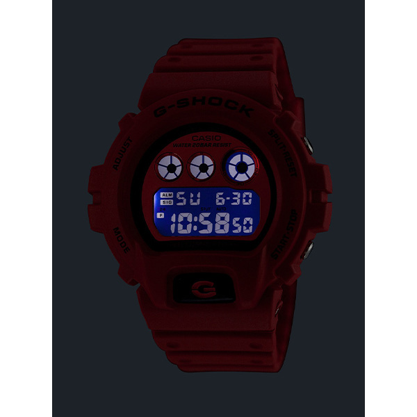 時計のフェイスに施された赤の色合いがバンドやベゼルと調和し、力強く質感のコントラストが印象的なデザインに仕上がっています。液晶には反転液晶を採用し、各所にブラックカラーを取り入れることでデザイン性を高めています。ブラックのアクセントカラーが赤を引き立て、強さとインパクトを与え、G-SHOCKのアイデンティティを表現しています。