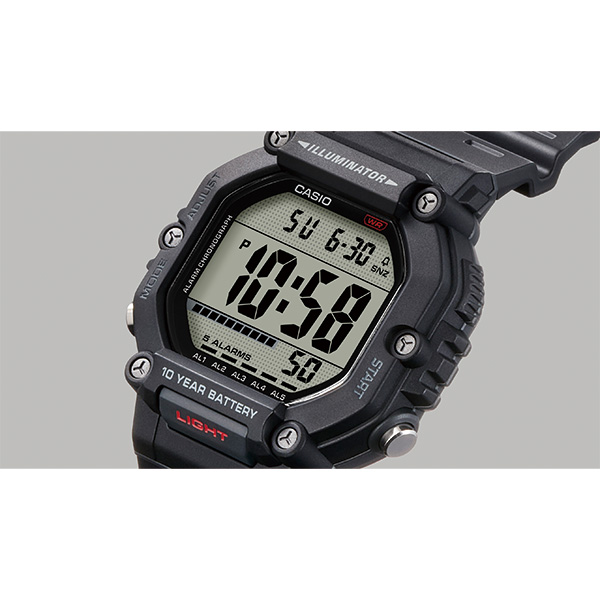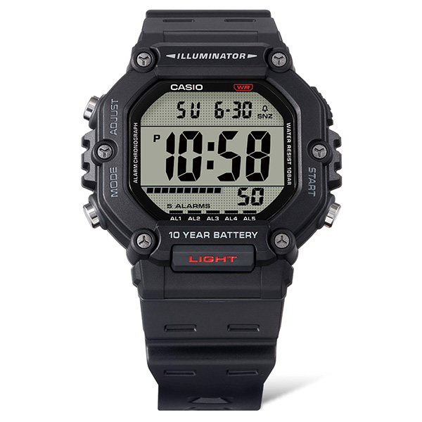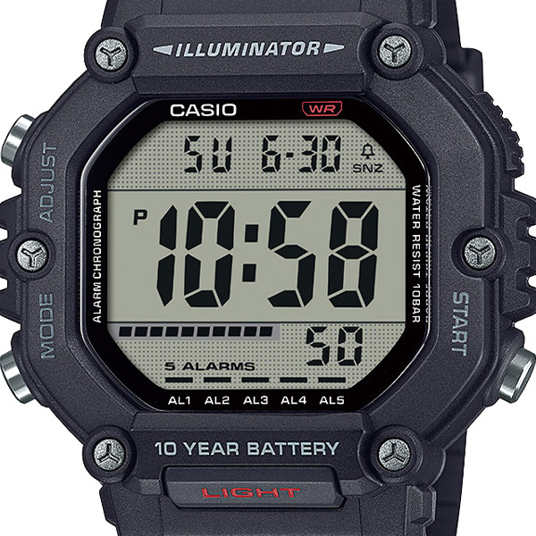 大型液晶を搭載した、ビッグケースのヘビーデューティなモデルです。LEDバックライト専用のボタンをフロント部分に配置しているので、暗闇でも簡単に操作できます。長く安心して使える10気圧防水と電池寿命約10年を実現し、デュアルタイム、ストップウオッチ、タイマー、アラームなどの実用的な機能を搭載。日常生活はもちろん、スポーツ、レジャーなど、幅広いシーンで活躍します。