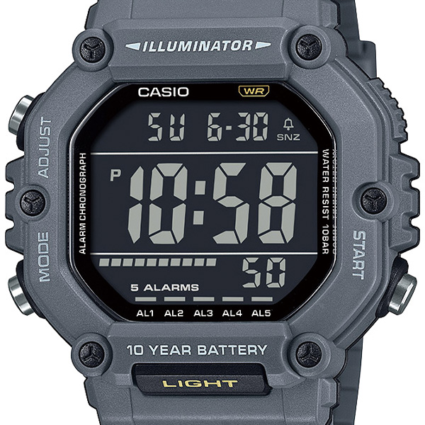 大型液晶を搭載した、ビッグケースのヘビーデューティなモデルです。LEDバックライト専用のボタンをフロント部分に配置しているので、暗闇でも簡単に操作できます。長く安心して使える10気圧防水と電池寿命約10年を実現し、デュアルタイム、ストップウオッチ、タイマー、アラームなどの実用的な機能を搭載。日常生活はもちろん、スポーツ、レジャーなど、幅広いシーンで活躍します。