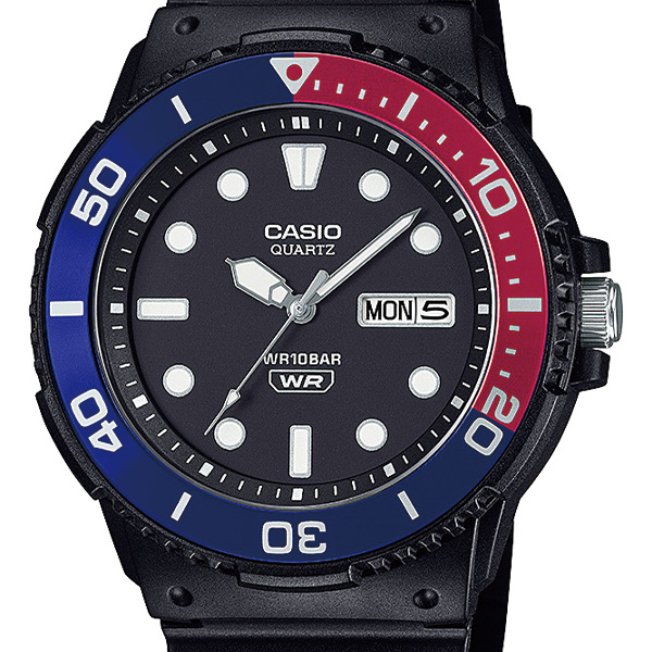マリンデザインが特徴の、回転ベゼル付きアナログウオッチです。ベゼル天面に配置されたアルミ素材のリングが、光を反射して輝き、目を引きます。10気圧防水、日付・曜日表示等、日常に便利な機能を搭載しています。