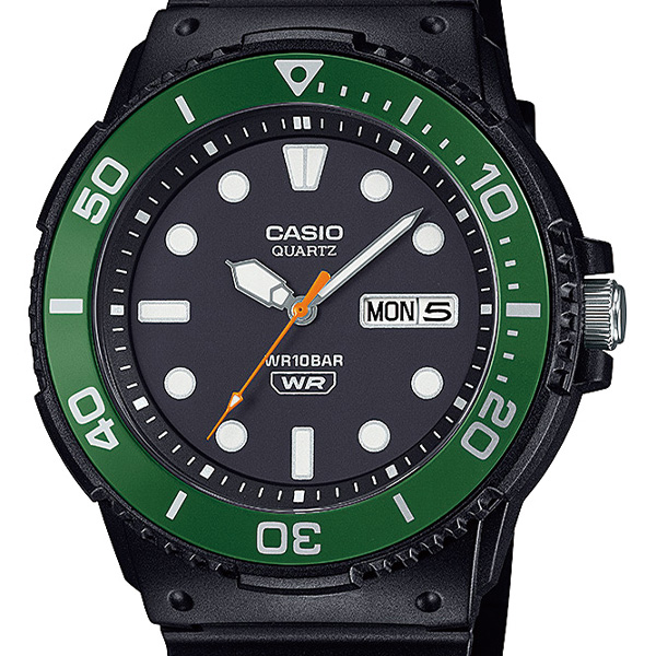 マリンデザインが特徴の、回転ベゼル付きアナログウオッチです。ベゼル天面に配置されたアルミ素材のリングが、光を反射して輝き、目を引きます。10気圧防水、日付・曜日表示等、日常に便利な機能を搭載しています。