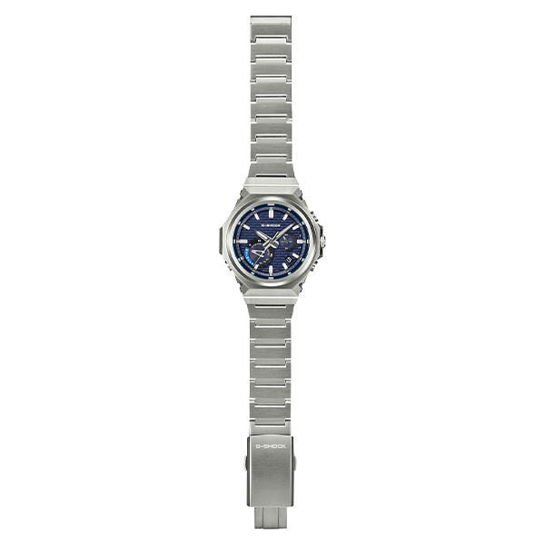 ロゴを排してクリーンな印象に仕上げたベゼルは、縦のヘアライン、円系のヘアライン、ミラー仕上げの3種で磨き分けられ、光の角度で表情を変え、豊かな質感を演出します。GST-B1000のために開発されたステンレススチール製のバンドには、ヘアライン仕上げとミラー仕上げを施しています。新開発の三つ折れ式中留は、端正なデザインとホールドが魅力。控えめな佇まいが、腕元に上質な空気を纏います。
