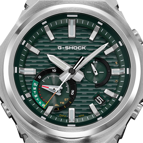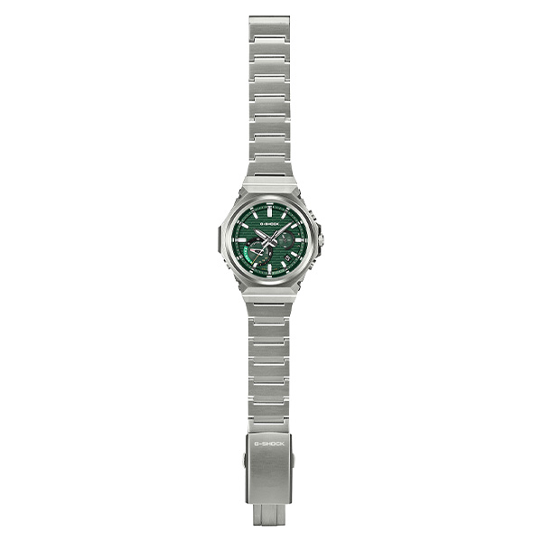 ロゴを排してクリーンな印象に仕上げたベゼルは、縦のヘアライン、円系のヘアライン、ミラー仕上げの3種で磨き分けられ、光の角度で表情を変え、豊かな質感を演出します。GST-B1000のために開発されたステンレススチール製のバンドには、ヘアライン仕上げとミラー仕上げを施しています。新開発の三つ折れ式中留は、端正なデザインとホールドが魅力。控えめな佇まいが、腕元に上質な空気を纏います。
