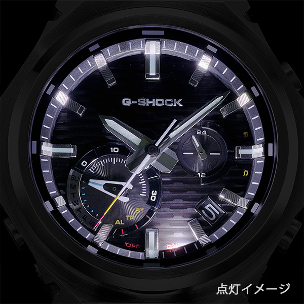 構造面では、メタルベゼルが外部からの衝撃をガードし、カーボンファイバー強化樹脂製のケースがモジュールを保護しています。また、メタルバンドの接続部分にはウレタン樹脂製の緩衝パーツを採用することで、バンド接合部に加わる衝撃を吸収し、メタルバンドの連結強度を高めています。さらに、ガラス接着方式や小型モジュールを採用することで、耐衝撃構造を実現しつつ、厚みや重量を削減。快適な着け心地と実用性を両立しています。