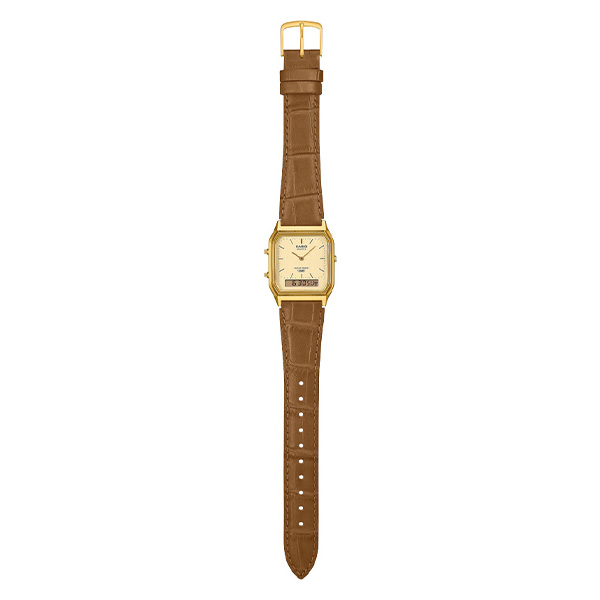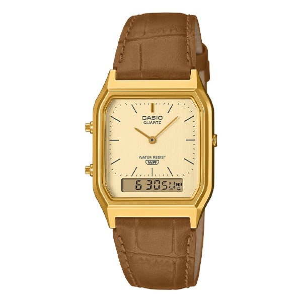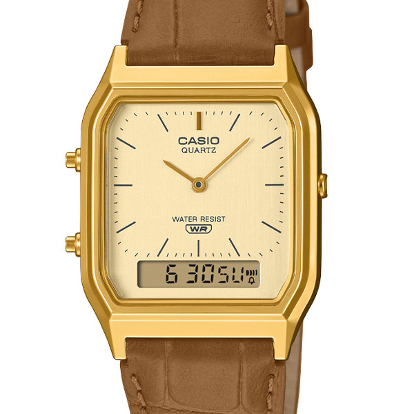 ヴィンテージな装いのアナログ・デジタルコンビネーションモデルです。ベースモデルは角型フェイスにアナログ時計とデジタル表示を組み合わせた人気のAQ-230。日常生活用防水やストップウオッチ、アラーム等、便利な機能も備えています。新たに追加されたカラーバリエーションでは、シルバーケースにはブラックレザーバンドを組み合わせ、モダンで洗練された印象を与えます。ゴールドケースにはブラウンレザーバンドを組み合わせ、クラシカルでエレガントな印象を与え、温かみのある上品なスタイルを楽しめます。どちらのバンドもクラシカルな型押しデザインが施されており、細部にまでこだわった高級感を感じさせます。新しいカラーバリエーションで、あなたの腕元に特別な魅力を添えてみませんか。