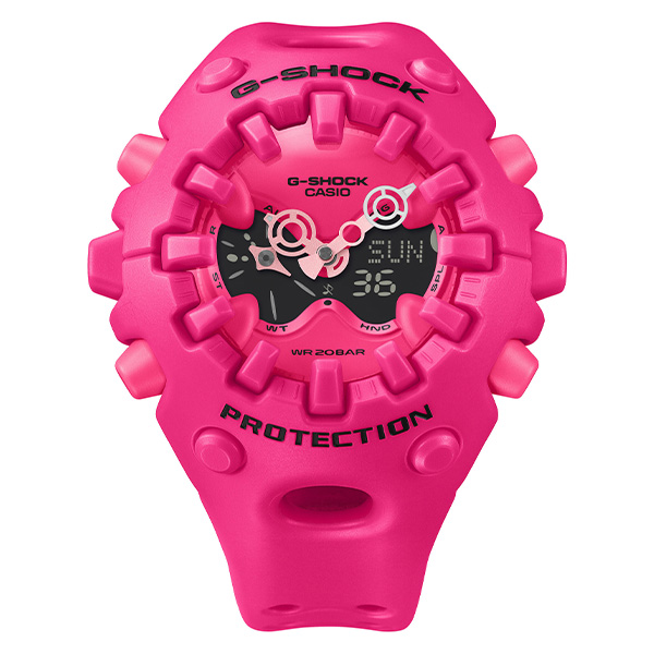 エッジの効いたパーツを組み合わせた有機的な外装フォルム、2つの穴が大きな特徴となっている新開発のショックリリース針など、今までの常識を覆す斬新な発想で、強さを求めて挑戦を続けるG-SHOCKのアイデンティティを形にしました。モジュールを保護するセンターケースを、ベゼル・バンド一体構造の外装パーツでカバー。大型の立体インデックスをガラス上面に配置することで、衝撃を緩和するバンパーの役割を持たせました。G-SHOCK独自の耐衝撃性能をキープしながら、ユニークかつ力強い外装デザインを実現しています。衝撃の影響を受けやすい針をシャフトに固定せず、磁石の力で取り付けるマグネティックホールディング構造を開発しました。この構造で取り付けたショックリリース針(分針)は、磁力で固定されているため、受けた衝撃を受け流すことができます。本構造を採用することで、針の大型化やデザインの自由度を上げることが可能になりました。