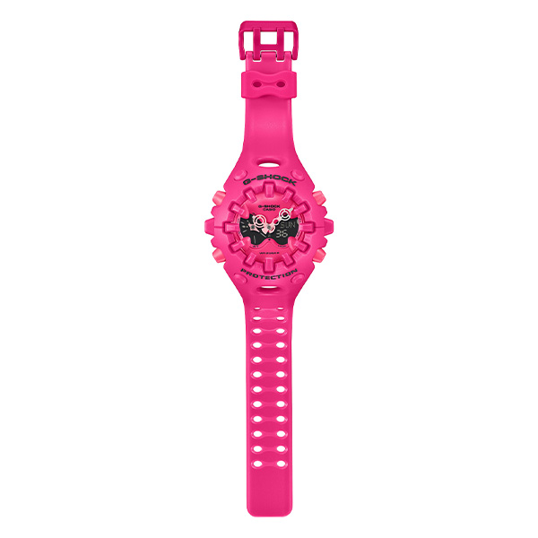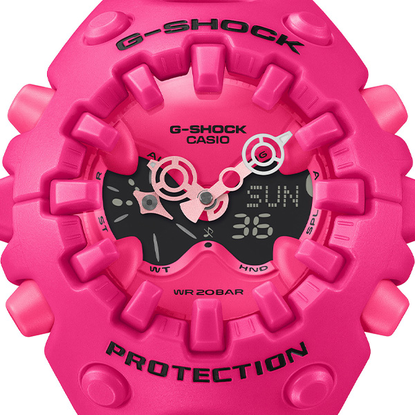アナログ・デジタルコンビネーションタイプのフェイスに、オープンワーク(透かしの部分をつくる技法)を施したダイアルとフルスクリーンLCDのレイヤー構造を採用。センターに異形タイプの時分針、液晶内に小針をレイアウトするなど、個性的なデザインに仕上げています。カラーは4色。シルバーのメタリックカラー、ブルーパープルやネオンイエロー、そしてG-SHOCKらしいブラックをラインアップしました。大容量電池の採用と低消費電力化により、アラームやライトなどの機能を搭載しながら電池寿命約10年を実現したモデルです。