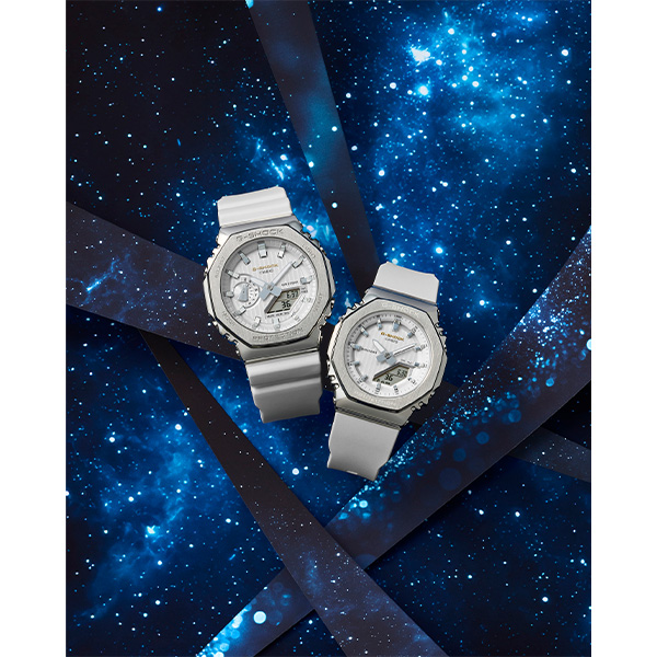 カラーバリエーションは「ネイビー」「ホワイト」の2色展開で、ネイビーは「夜空」、ホワイトは「流れ星」をイメージしています。文字板のG-SHOCKのロゴのゴールドカラーは星の輝きを、文字板上のストライプパターンは星が降り注ぐ様子を表現しています。