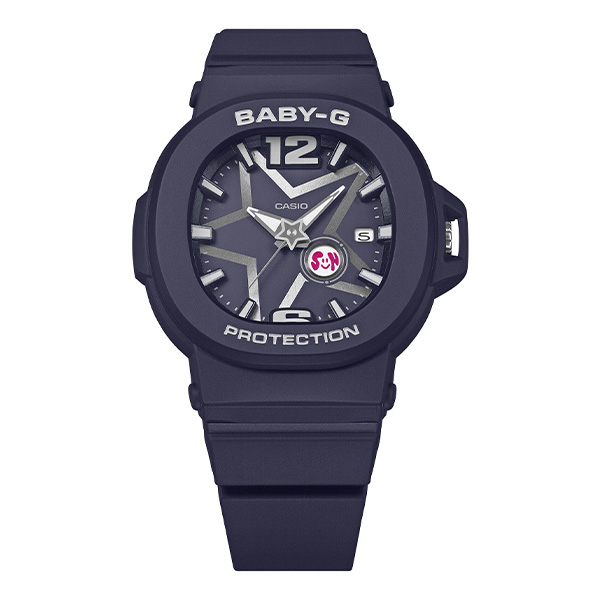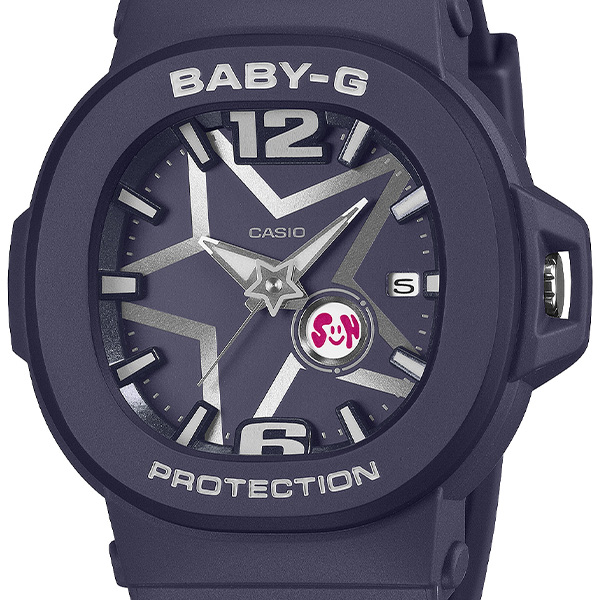 アクティブな女性に向けた耐衝撃・カジュアルウオッチBABY-Gから、文字板に煌めく星をあしらったY3Kスタイルのウオッチです。メタリックカラーの星を大胆にレイアウトしたダイアルと、メタリック仕上げを施した立体インデックスが、フューチャリスティックな世界観を際立たせるデザイン。針軸には星型のモチーフをあしらい、BABY-Gらしい遊び心もプラスしています。曜日表示は日替わりでデザインが変わり、ポップなフォントとカラーで、フェイスに毎日の楽しさを添えます。耐衝撃構造や10気圧防水機能など、日常のアクティブシーンに欠かせない頼れる機能も充実。日常生活はもちろん、スポーツやレジャーシーンも安心。アクティブな毎日を応援します。