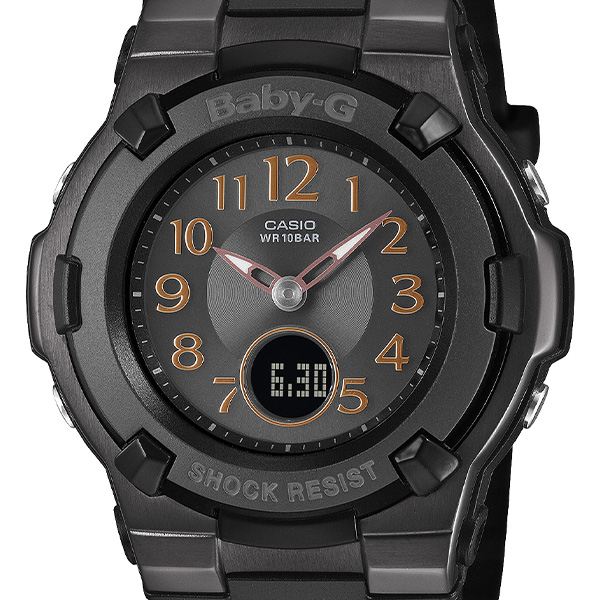アクティブな女性のためのカジュアルウオッチ、BABY-Gから、どんな服装にも合わせやすいダークカラーを纏った電波ソーラーモデルです。ベースカラーにはブラックとブラウンをセレクトし、上品で落ち着いた印象を与えます。メタル素材を使用したベゼルやフルアラビックのインデックスで、プライベートでもオフィスでも使いやすいデザインに仕上げています。6時位置には便利な日付や曜日を示す小窓も配され、機能性も兼ね備えています。また、耐衝撃構造や10気圧防水機能はもちろん、世界6局の電波受信が可能なマルチバンド6とタフソーラーを搭載し、アクティブな活動をサポートする実用性を備えています。