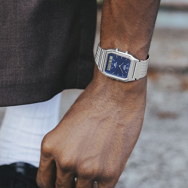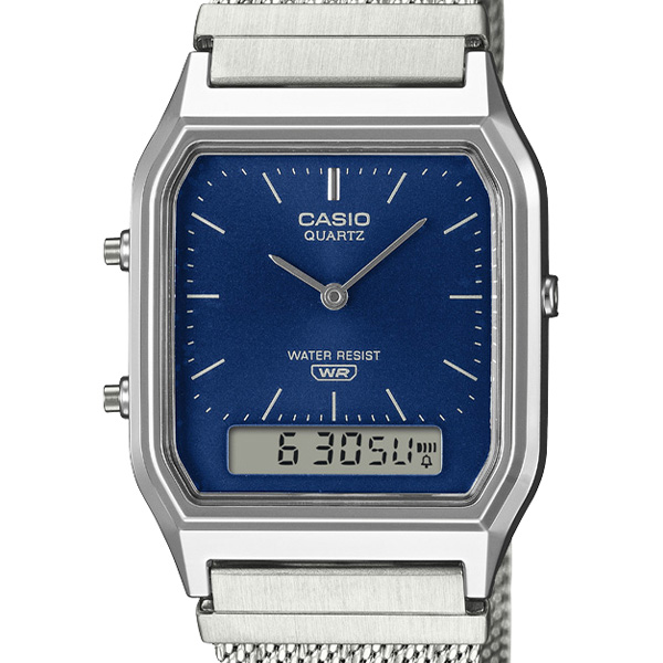 使い勝手の良さで根強い人気を誇るデジタルウオッチ、A158と、角型フェイスにアナログ時計とデジタル表示を組み合わせたAQ230を、メッシュバンド仕様に仕立てたスタイリッシュなウオッチです。メッシュバンドをベースに縦方向にプレスを入れ、立体感のあるデザインを実現しました。腕元に洗練された印象を添えつつ、快適な装着感を実現します。