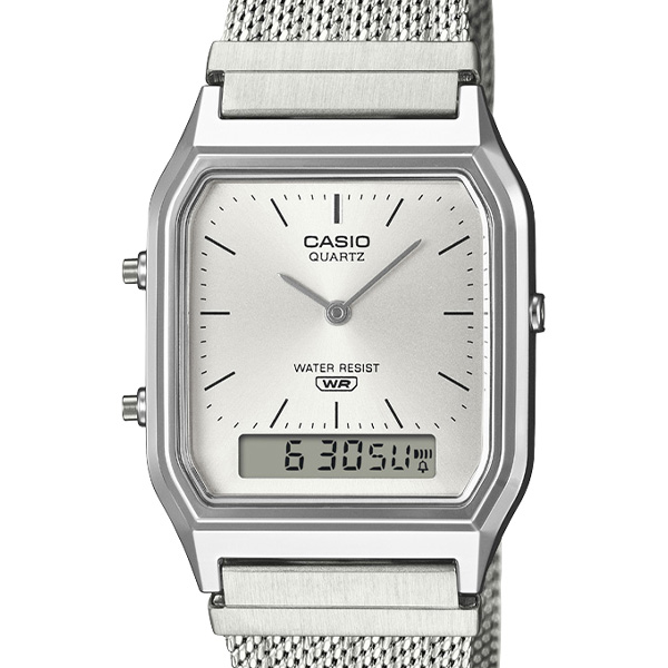 使い勝手の良さで根強い人気を誇るデジタルウオッチ、A158と、角型フェイスにアナログ時計とデジタル表示を組み合わせたAQ230を、メッシュバンド仕様に仕立てたスタイリッシュなウオッチです。メッシュバンドをベースに縦方向にプレスを入れ、立体感のあるデザインを実現しました。腕元に洗練された印象を添えつつ、快適な装着感を実現します。