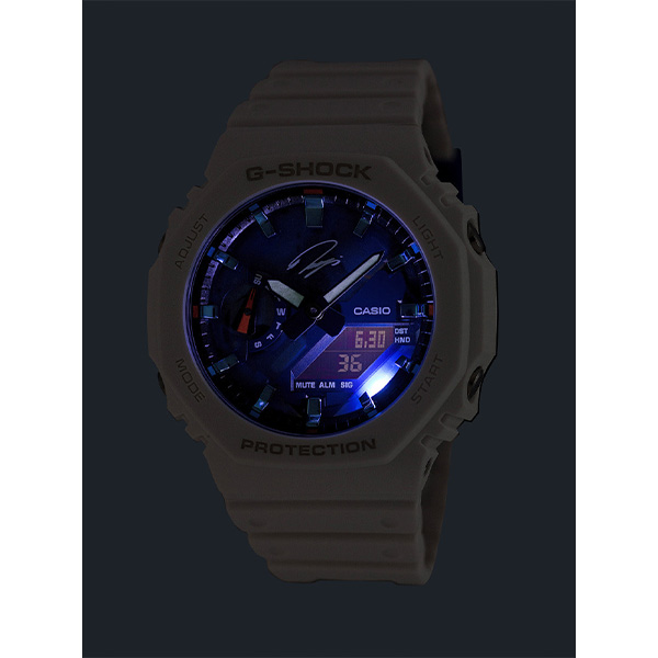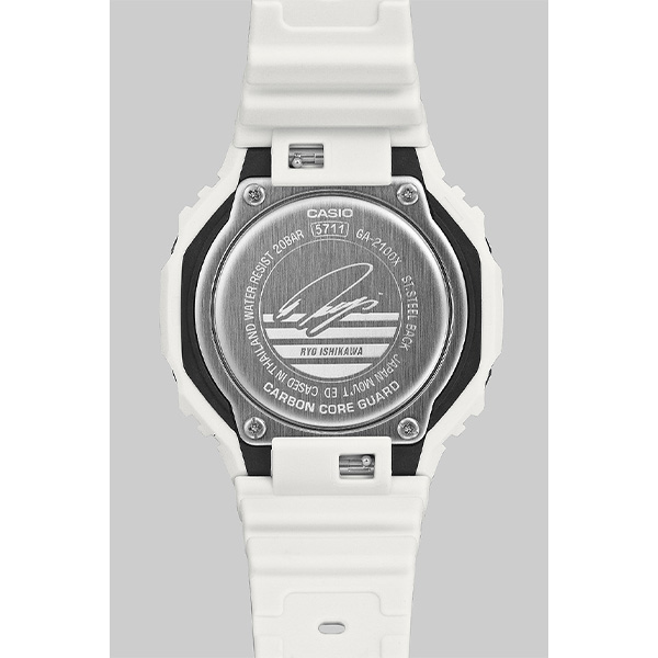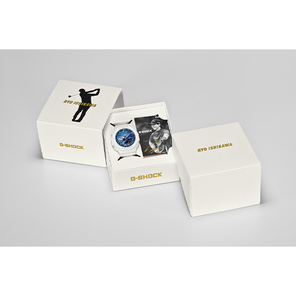 ベースモデルはオクタゴンベゼルのGA-2100で、ゴルフスイング中も邪魔にならない薄型ケースを採用。文字板には闘志を秘めた冷静のブルー、全体は潔さと覚悟を表すホワイト、差し色には希望を意味するオレンジを配色し、どんなゴルフウェアにも合わせやすいカラーリングに仕上げました。また、文字板はスケルトンを採用することで、今までにない印象的なデザインとなっています。石川遼選手のサインを12時位置と裏蓋に施し、トレーディングカードが付属したスペシャルパッケージと合わせ、特別な仕様となっています。