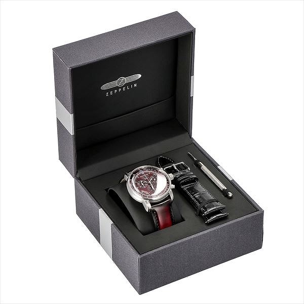 ベストセラー100周年記念シリーズクロノグラフアラームに新たに開発された、赤い文字盤のモデルが登場。この赤い文字盤は、 1927年に飛行船LZ127 号が世界一周の偉業に挑んだ際、飛行船の機体に映し出された美しい夕日の色を体現しています。交換用のベルトが付属した専用BOXでギフトにもおすすめの1本です。