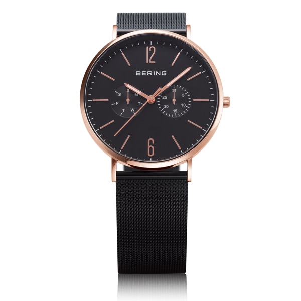 ポリッシュ加工で磨かれたローズゴールドのケースとバーインデックス、ステッチをあしらった厚みのあるレザーストラップは上品な印象を与え、価格以上の見た目を実現しています。ラグ部分が滑らかなカーブを描く流線形のケースは腕へのフィット感が高く、袖口で邪魔になることもありません。レザーベルト、メッシュベルトともにブラックで付け替えても大きな変化はないように感じられますが、実際は質感が変わるだけでもレザーは上品に、メッシュベルトはカジュアルに、と印象が大きく異なりますので、ぜひ2種類ともお楽しみいただきたいモデルです。
