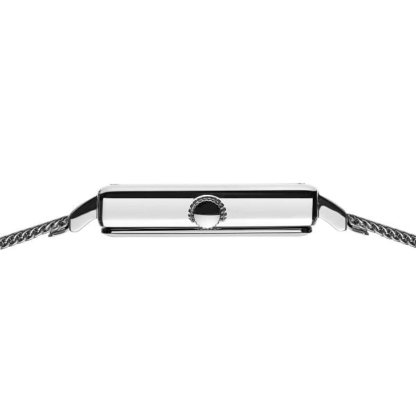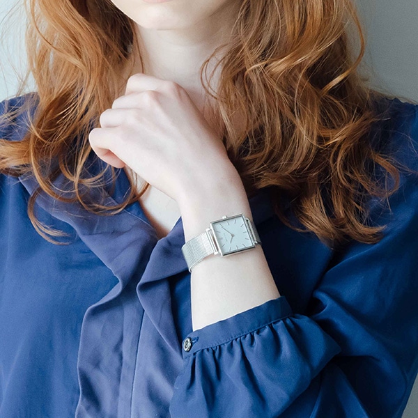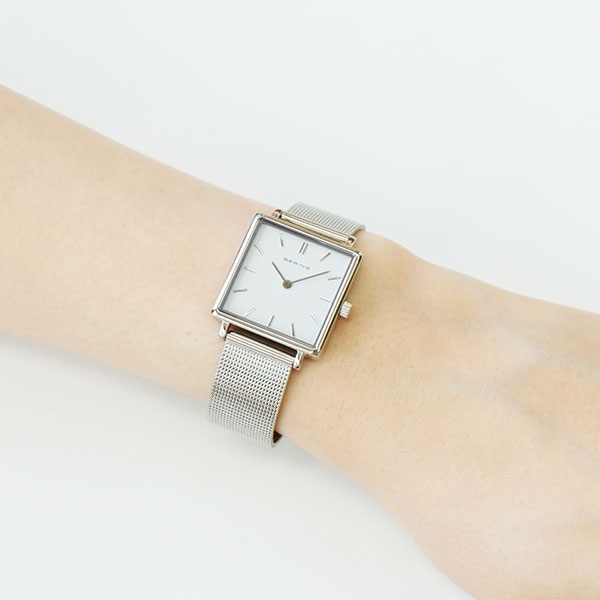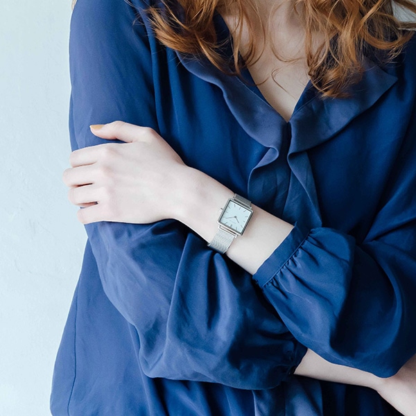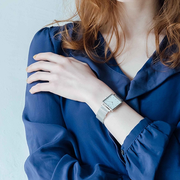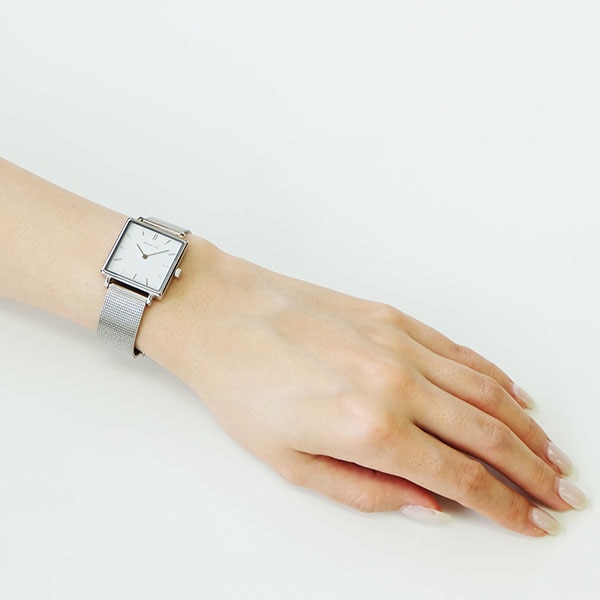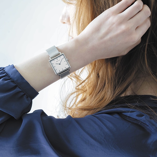 バーインデックスのシンプルな文字盤に、26mmのミニマルで特徴的なスクエアケースを合わせたクラシカルなコレクション。オンオフ問わず着用できるシンプルなデザインで、シルバー×ホワイトのクリーンな雰囲気をまとったカラー。厚さも6.5mmとスリムなケースで着けやすいサイズ感です。コーディネートしやすいカラーリング、汗・水に強く通年で使用しやすいメッシュベルトなど、使い勝手がよくトレンドに左右されないタイムレスなモデルに仕上げた一本です。
