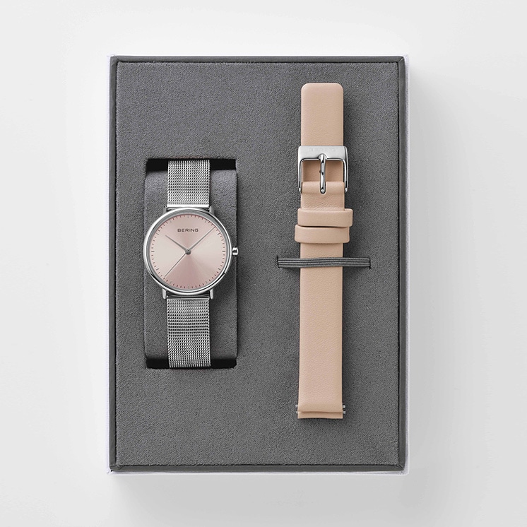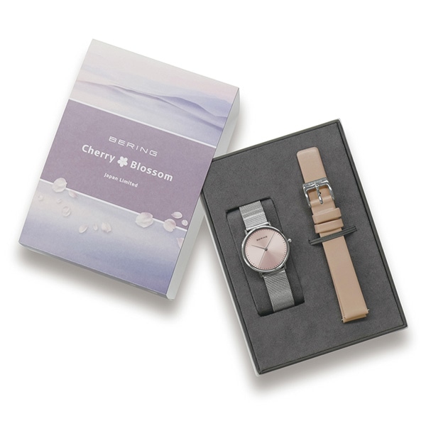 日本とデンマークの友好のシンボルとして寄贈されたランゲリニエア公園の桜。2つの国で咲く美しい桜の花をモチーフにデザインされた数量限定のコレクションです。明るすぎず主張しずぎないトーンのピンクダイヤルはコーディネートに取り入れやすく、厚さ5mmのスリムケース、刻みの細かいメモリ、2本付属のストラップと実用性も兼ね揃えています。裏蓋には限定の印であるシリアルナンバーが刻印されています。こちらのコレクションは環境問題に配慮し、FSC認定を受けた専用のエコボックスが付属します。