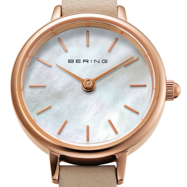 デンマークデザインらしいミニマルでクリーンな印象をもつクラシックコレクション。BERINGの中でも特に小さな22mmのケースに、幅6mmの細く繊細なストラップを組み合わせました。見る角度で表情を変えるパールのダイヤルを採用した3色は日本国内だけの限定カラーです。フラットで反射の少ないサファイアガラスを採用しながら1万円台で手に入る価格も魅力的です。