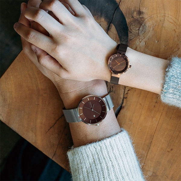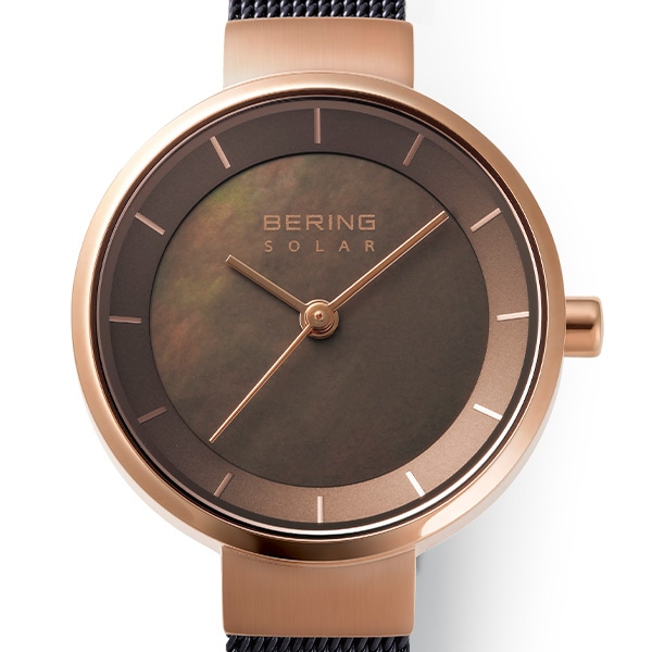 エレガンス、ミニマリズム、エコロジーが完璧にミックスされ、どんなシーンにもマッチします。軽量で薄型のため、腕に優しくフィットし、しなやかなミラネーゼストラップが着け心地を更に快適にしてくれます。ベーリングでも特に人気の高いブラウンカラーは肌なじみがよく、ほどよい主張でさまざまなコーディネートにもマッチします。おとなっぽく、アクセサリーのように腕時計を楽しみたい方におすすめのカラーです。ケースの大きさに対し、細身のベルトは腕周りをすっきりと見せ、華奢で上品な雰囲気が女性らしさを惹きたてます。