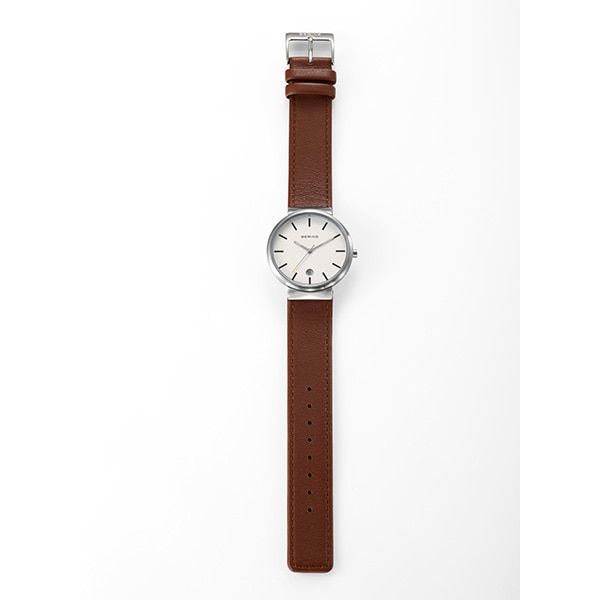 シンプルで実用的で、どこか温かみのあるデザイン。綺麗なカーブを描いたラウンド型のケースとステッチワークが入ったレザーストラップ。薄い凹みをもたせたインデックスに先端に色の入った秒針。3針の日付表示があるオーソドックスな時計ですが、北欧の家具の様にどこかほっとできるような優しいデザインの時計です。