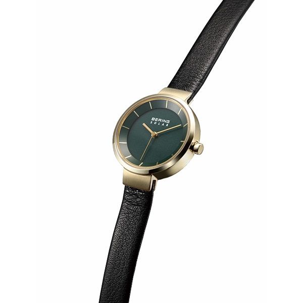 BERINGのコレクションの中でも定番で最も人気のあるシリーズ「Scandinavian Solar(スカンジナビアンソーラー)」。ソーラーウォッチはサスティナビリティの観点からも改めて注目されていますが、BERINGのソーラーウォッチは12本のバーと3つの針で構成された北欧ならではのミニマルで洗練されたデザインが特徴です。同シリーズでは唯一のレザーストラップを採用しています。今回、新色としてディープグリーンが加わります。2025のトレンドカラーでもあるグリーンですが、BERINGは普段使いしやすく、素材の上質さが伝わるような深いグリーンをダイヤルに採用しました。ブラックに近い深めのグリーンは、カジュアルな装いの差し色としても、スーツやジャケットを羽織るビジネスシーンでも着用して頂けます。