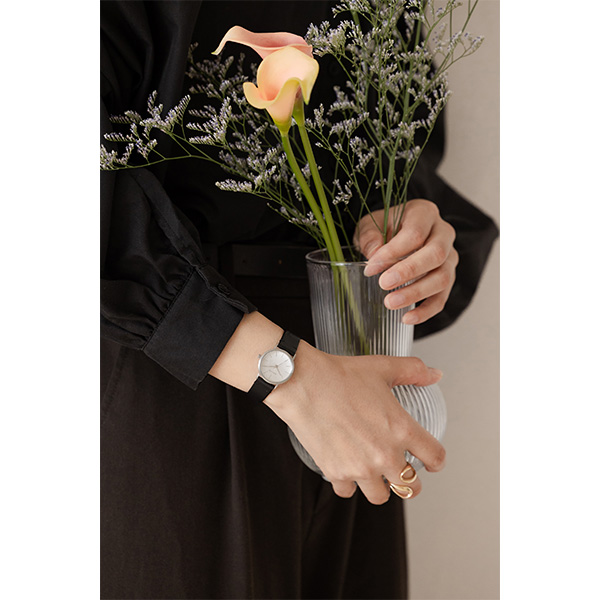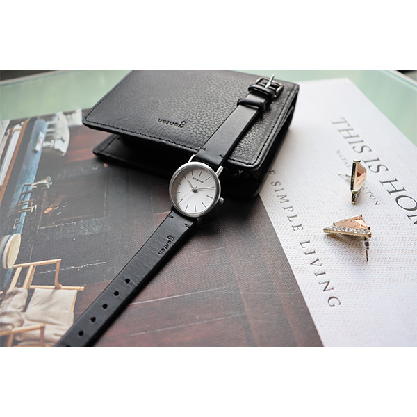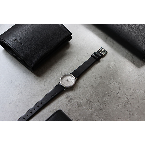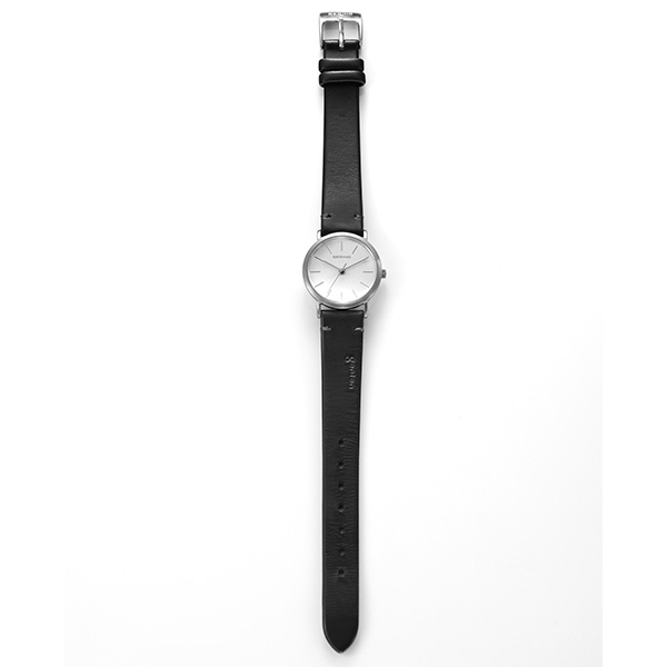 gentenとBERINGが大切にしている考えや想いを、このプロダクトが体現しています。それは、シンプルで目立ちすぎず自然に馴染むデザインであること、長く使い続けることができる素材で、愛着が持てること。このコラボレーションでは、黒のミネルヴァレザーを採用することでより静かに、より凛とした佇まいのプロダクトに仕上がりました。gentenを代表する革ミネルヴァは、使うほどに艶が増し、着用した方それぞれの時間を映すように育っていきます。3針とバーのインデックスで構成されたミニマルなデザインと、傷の付きにくいサファイアガラスはどんなシーンでも安心して身に着けることができます。そして控えめに入れたgentenのロゴや、ストラップの付根に施したステッチ、裏蓋の刻印など、このプロダクトだけの拘りのディティールがふんだんに盛り込まれています。身に着けることで、忙しない毎日の中でふと時間を意識するきっかけになるような、静かな気付きを得られるような、確かな素材で丁寧に仕上げられたプロダクトです。