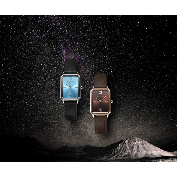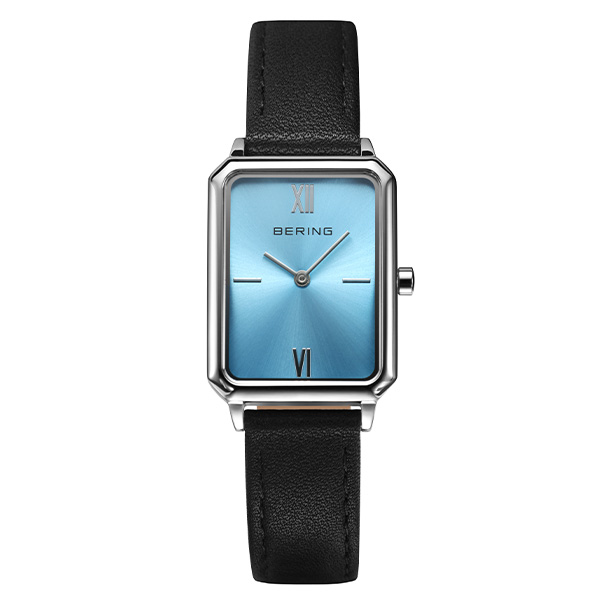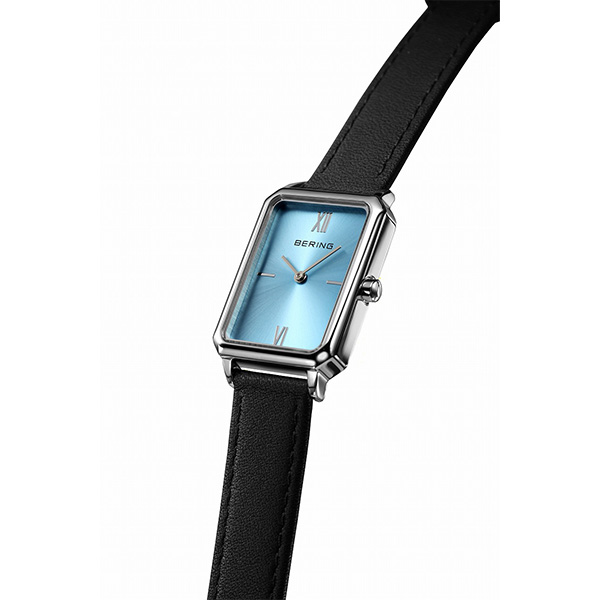 クラシックでスマートな印象のレクタングル型ケース。ブランドを象徴するアイスブルーと高級感のあるチャコールのダイヤルをレザーストラップに合わせました。 性別を問わず着用できる23mm×30mmの程よいサイズ感のレクタングル型ケース。厚みも7mmと薄型でクラシックでスマートな印象を与えてくれます。 BERINGブランドを象徴するカラーでもある美しいアイスブルーと、高級感溢れる落ち着いた光沢のチャコールをダイヤルに配し、ストラップは14mmのステッチ入りレザーをあわせました。 フェイスのデザインは、12時と6時位置にBERINGでは珍しいローマ数字を、3時と6時位置にバーを使用しており、それ以外のインデックスを省くことで、全体をすっきりとした美しい印象に仕上げています。