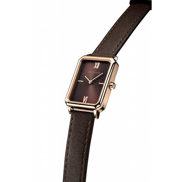 クラシックでスマートな印象のレクタングル型ケース。ブランドを象徴するアイスブルーと高級感のあるチャコールのダイヤルをレザーストラップに合わせました。 性別を問わず着用できる23mm×30mmの程よいサイズ感のレクタングル型ケース。厚みも7mmと薄型でクラシックでスマートな印象を与えてくれます。 BERINGブランドを象徴するカラーでもある美しいアイスブルーと、高級感溢れる落ち着いた光沢のチャコールをダイヤルに配し、ストラップは14mmのステッチ入りレザーをあわせました。 フェイスのデザインは、12時と6時位置にBERINGでは珍しいローマ数字を、3時と6時位置にバーを使用しており、それ以外のインデックスを省くことで、全体をすっきりとした美しい印象に仕上げています。