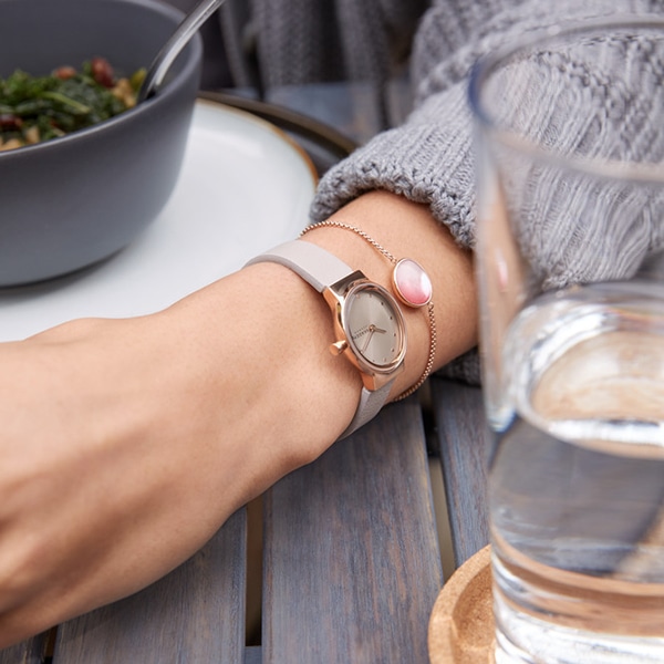 26mm径のステンレススチール製ケースに二針ムーブメントを搭載したFREJA。グレーのサンレイダイヤルに、グレーのエコレザーストラップを組み合わせました。