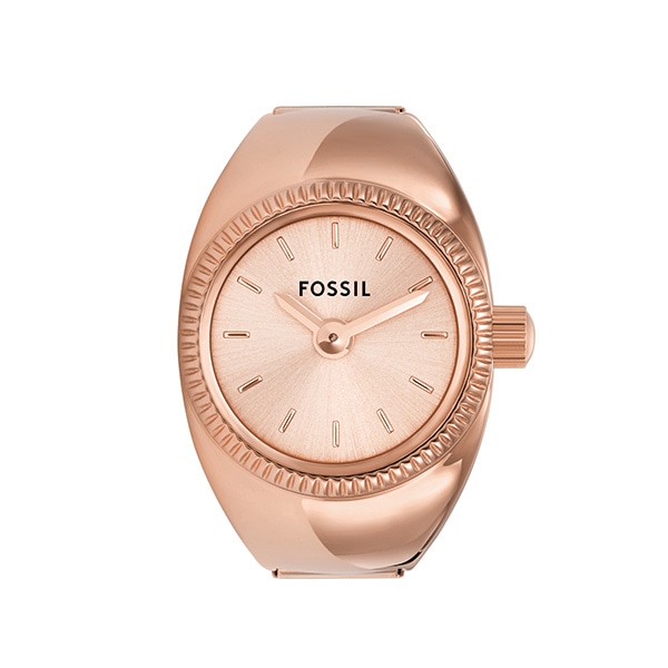 この 15 mm ウォッチ リングは、ローズ ゴールド トーンのサンレイ ダイヤル、2 針ムーブメント、ローズ ゴールド トーンのステンレス スチール バンドが特徴です。