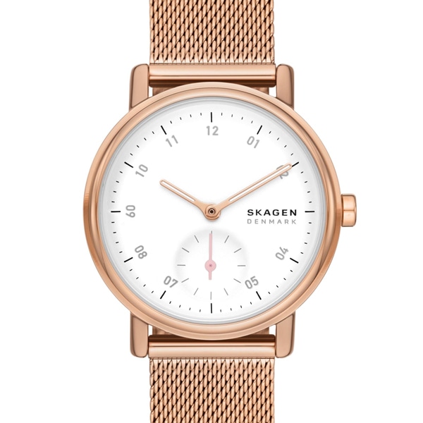 32mm径ケースに二針サブセコンドムーブメントを搭載した、KUPPEL LILLE。ホワイトのサンドブラストダイヤルに、ローズゴールドトーンのステンレススチールメッシュストラップを組み合わせました。ウォッチストラップは付け替え可能です。