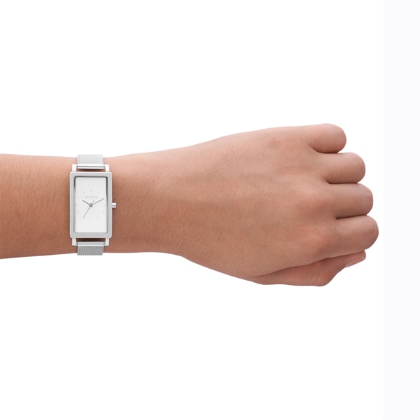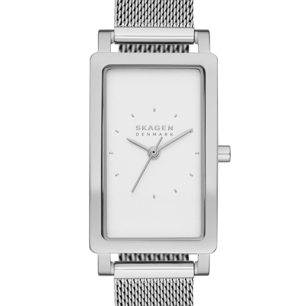 43x22mmのタンク型ケースに三針ムーブメントを搭載したHAGEN。ホワイトのサンドブラストダイヤルに、シルバートーンのステンレススチール製メッシュストラップを組み合わせました。ウォッチストラップは付け替え可能です。